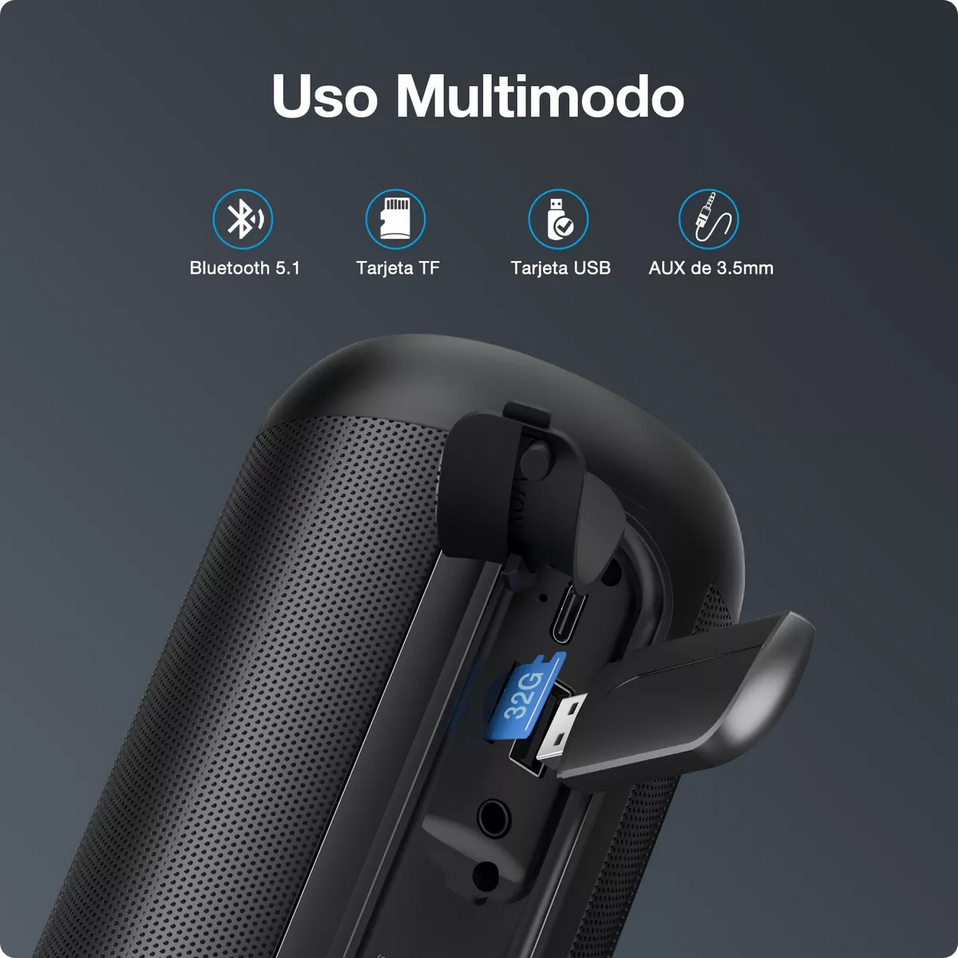 Llamadas Manos Libres: Soporta radio FM, entrada USB, entrada de tarjeta micro SD y entrada de jack de 3.5 mm. El altavoz también cuenta con un micrófono incorporado, lo que te permite responder llamadas directamente desde el bocinas bluetooth. Puedes tener conversaciones claras y sin manos, lo que resulta conveniente para conferencias o charlas con amigos. (Solo se admiten formatos MP3/WAV)